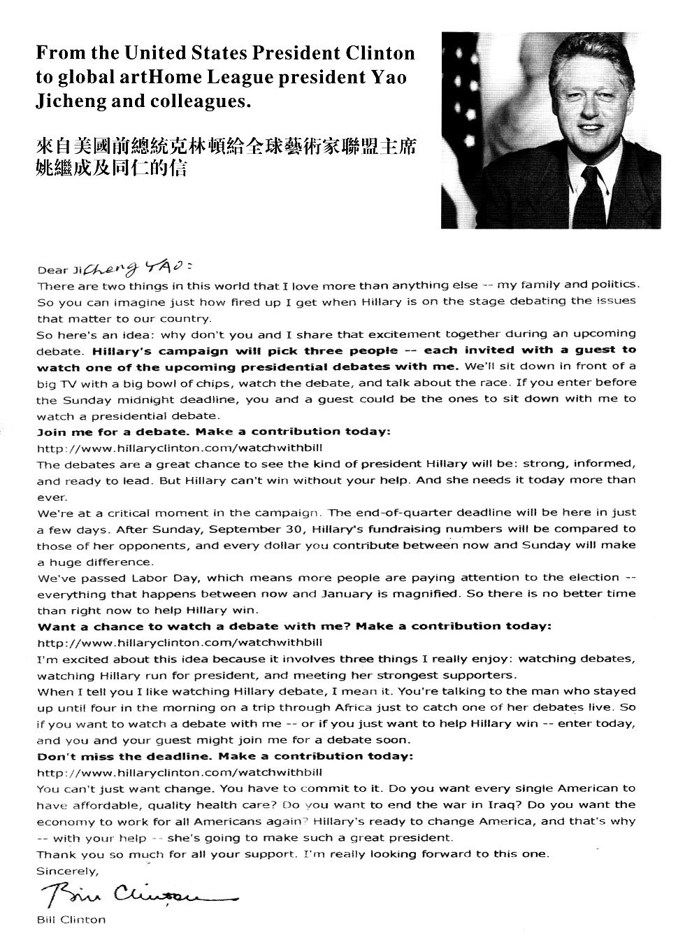 美國前總統克林頓給全球藝術家聯盟主席姚繼成及同仁的信